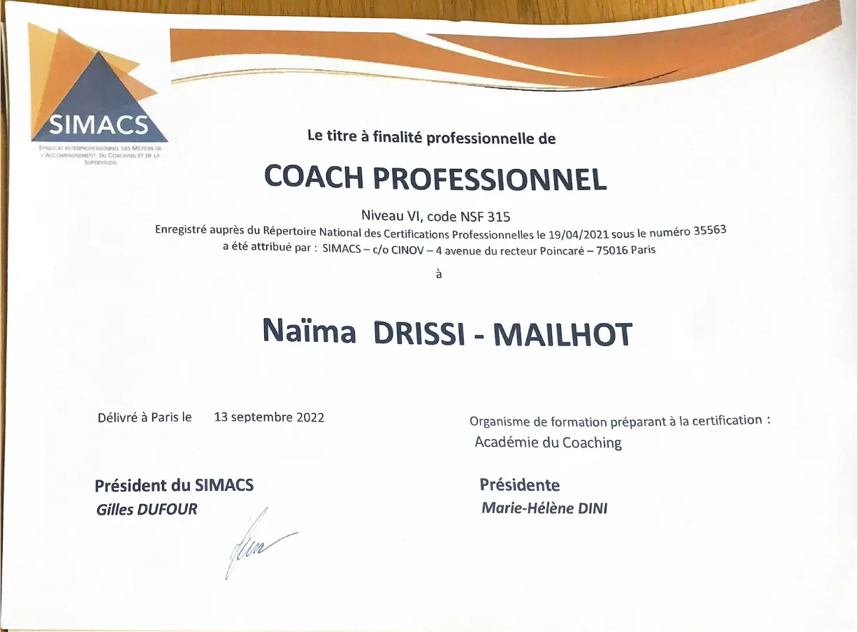 En tant que coach professionnelle certifiée, je mets à votre disposition une expertise reconnue pour vous accompagner efficacement. Vous trouverez mon diplôme, garantissant ma certification et mon engagement à vous offrir un accompagnement sérieux et de qualité.